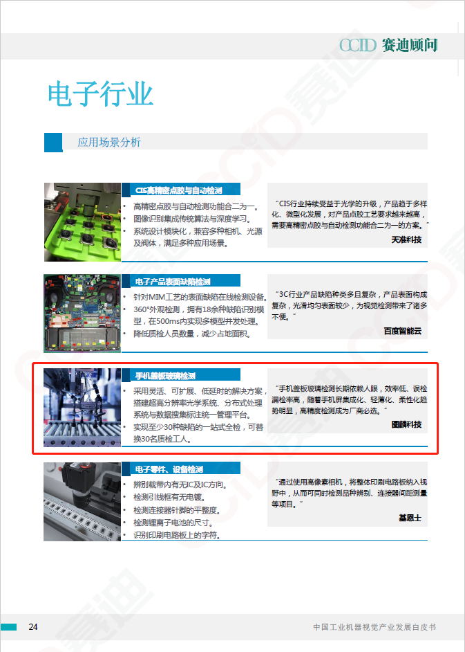 根据报告显示,2019年中国工业机器视觉市场规模约为138亿元,增速约为4.8%,电子、汽车和半导体是当前机器视觉最为主要的应用领域。作为全球领先的AI视觉解决方案及设备提供商,YABO鸭脖科技赋能电子领域质检智能化的创新案例——手机盖板玻璃检测,被白皮书收录。